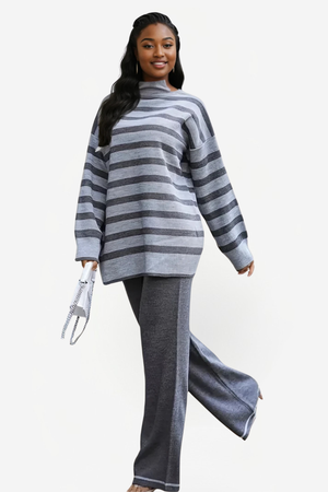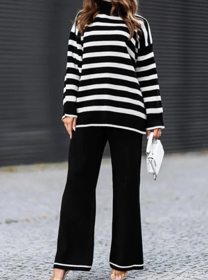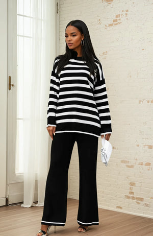 Verleihen Sie Ihrer Garderobe mit diesem Must-have-Set für Damen, bestehend aus langen, fließenden Hosen und einem übergroßen schwarz-weiß gestreiften Pullover, eine raffinierte Note. Inspiriert vom zeitlosen Stil der Pariser Frauen, kombiniert dieses Set auf brillante Weise Eleganz und Schlichtheit. Der Rollkragenpullover verfügt über weite Armlöcher und lange Ärmel, die Ihren Look aufwerten und ihm eine schicke und schlanke Silhouette verleihen. Entscheiden Sie sich für dezente, klassische Farbtöne, die Ihre Garderobe ergänzen und Ihnen zu jeder Tageszeit ein schönes Gefühl geben. Tragen Sie dazu Turnschuhe für einen lässigen Look oder Absätze für einen eleganteren Stil.