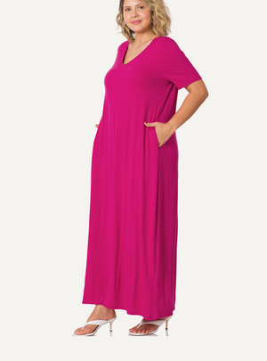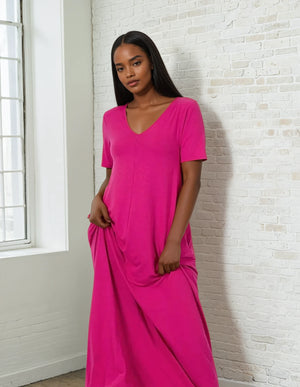 Setzen Sie ein Statement mit diesem fließenden Maxikleid mit zeitlosem Charme. Es verfügt über einen eleganten V-Ausschnitt und kurze Ärmel für eine schicke und bequeme, längliche Silhouette. Sein weicher und leichter Stoff schmeichelt der Haut und sorgt für einen luftigen Look bis zum Knöchel. Mit seinem schmeichelhaften Schnitt und den praktischen Taschen vereint es Stil und Funktionalität. Es wird in den USA aus einer luxuriösen Mischung aus Modal und Polyester hergestellt und garantiert außergewöhnliche Weichheit und Atmungsaktivität.