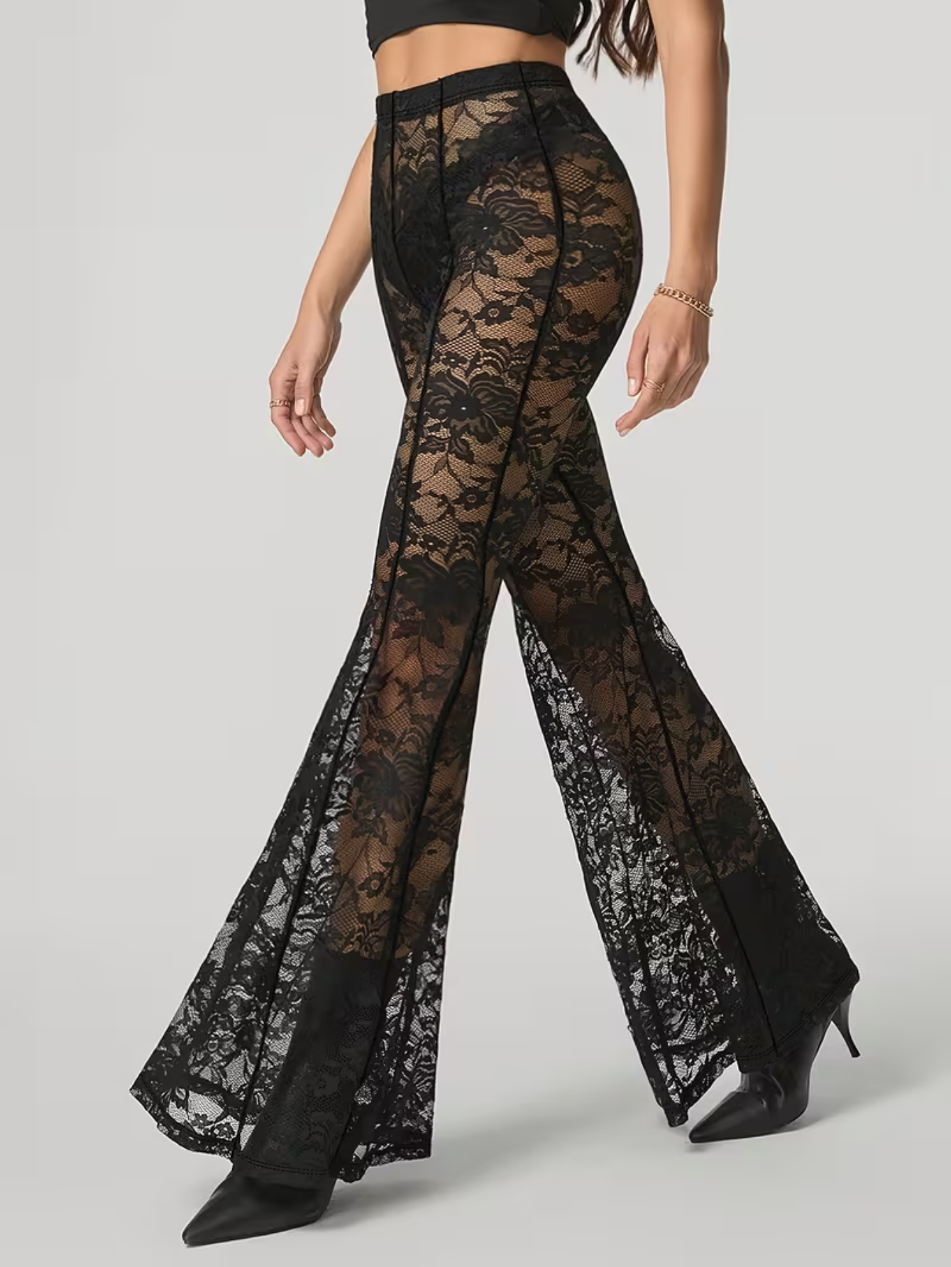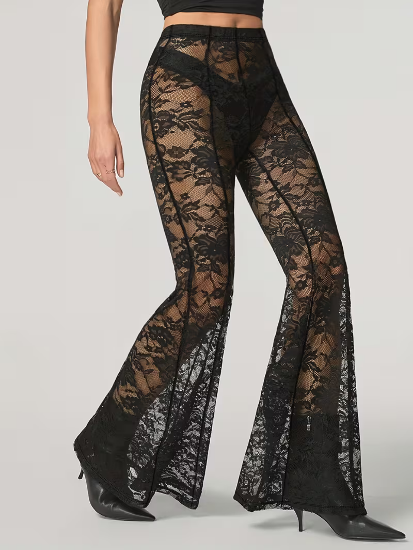 Pantalon Extensible Dentelle Transparent avec Ceinture Élastique