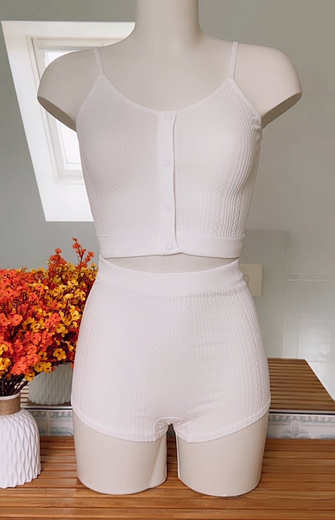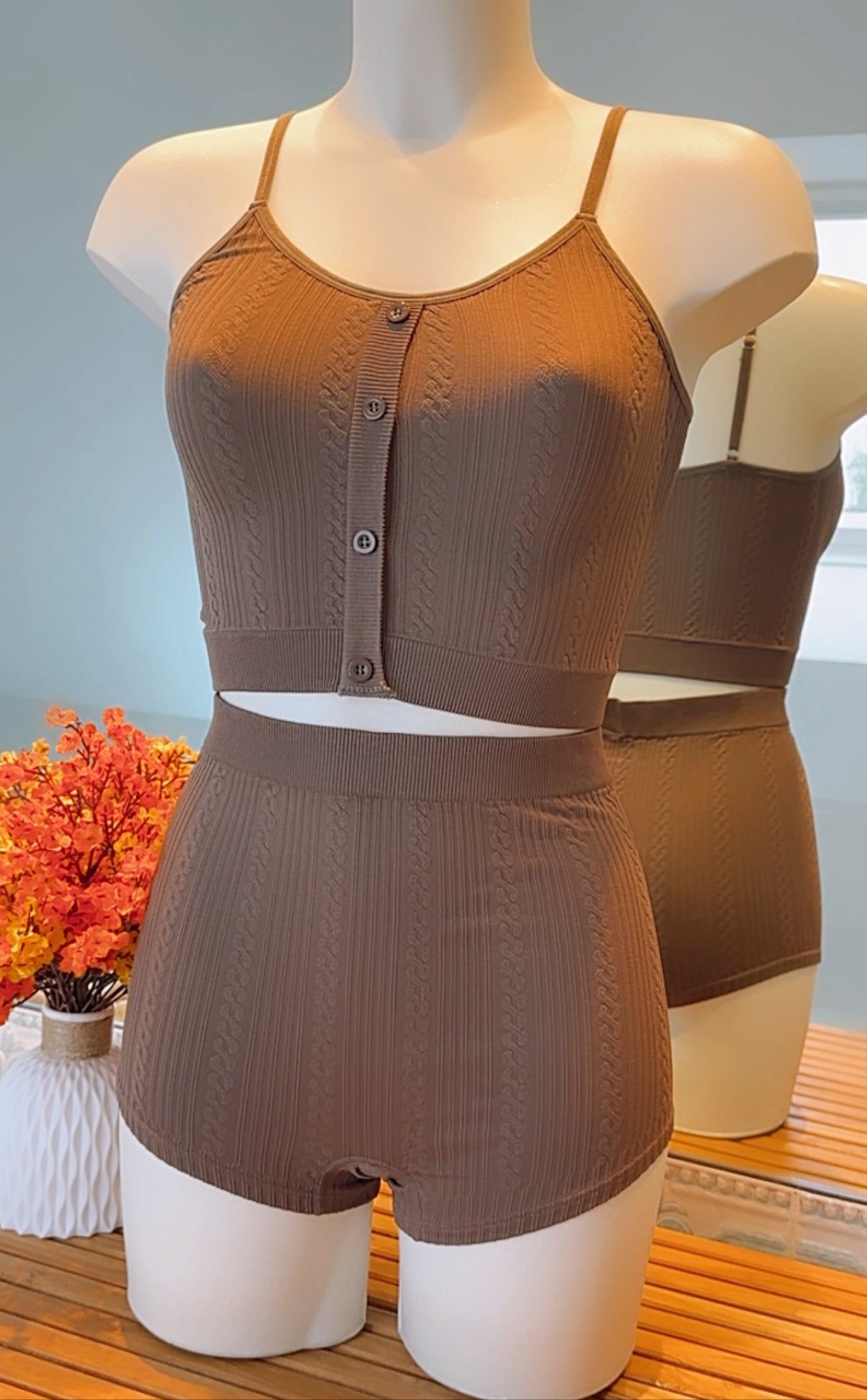 Notre ensemble lingerie conçu pour allier confort et style. Composé d'une brassière à bretelles fines et d'un short taille haute, il apporte une touche d'élégance à vos tenues décontractées. Fabriqué en tricot doux et extensible, cet ensemble garantit un confort optimal tout au long de la journée. Les motifs en losanges et les lignes géométriques ajoutent une modernité à votre look tout en restant tendance. La coupe épouse épouse parfaitement les courbes du corps, assurant un maintien plat. Polyvalent et facile à assortir, il convient aussi bien pour des moments de détente à la maison que pour des sorties décontractées. Optez pour cet ensemble et alliez élégance et aisance en toutes occasions.