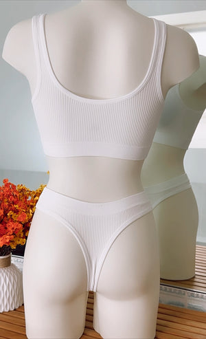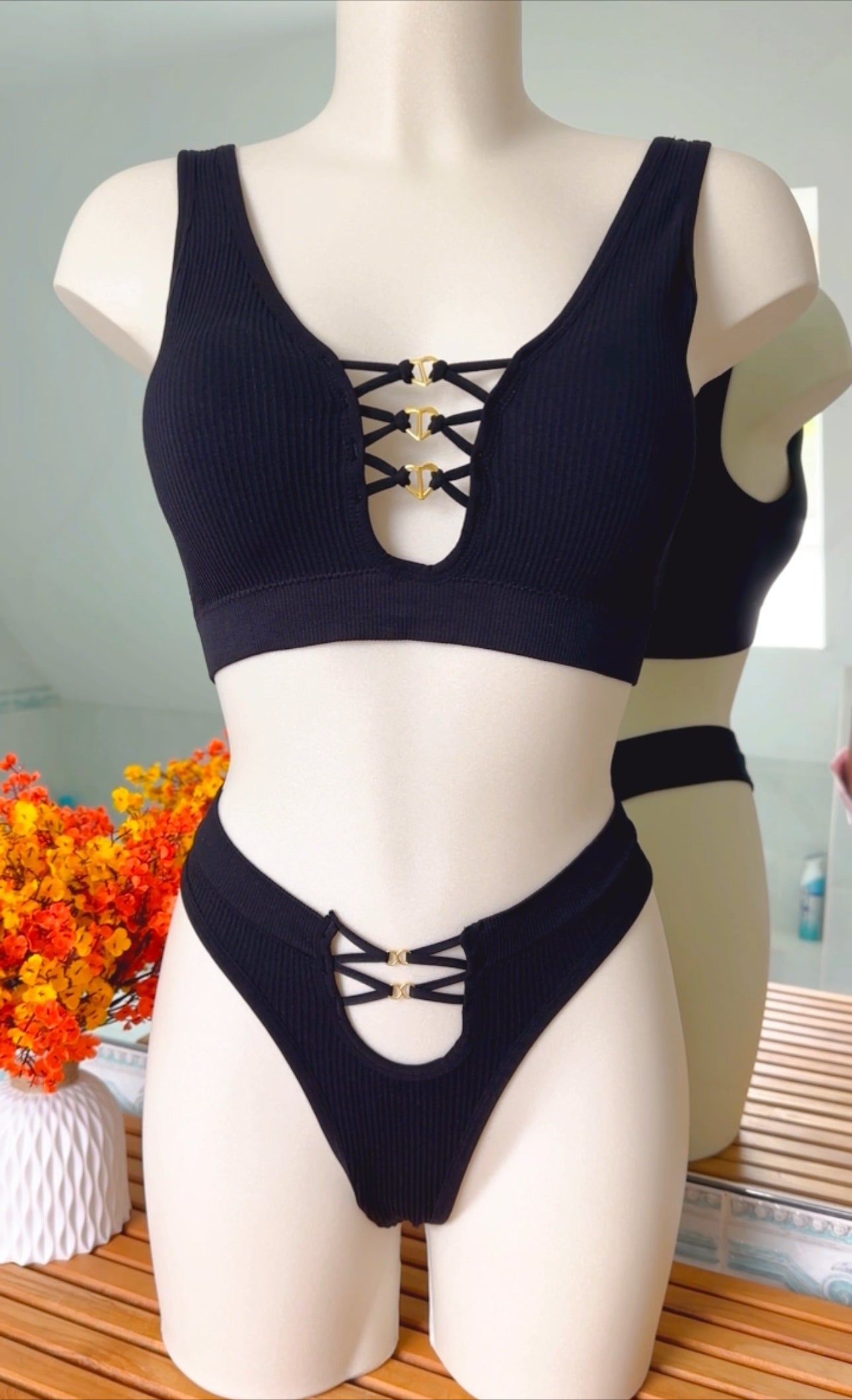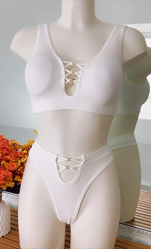 Découvrez notre ensemble de lingerie qui allie confort et style. Cet ensemble deux pièces comprend un soutien-gorge à col en V avec un design à lacets croisées dorées sur le devant, offrant un look à la fois élégant et séduisant. Le tissu côtelé offre un maintien confortable tout en épousant parfaitement les courbes de votre corps. Le string taille haute assortie présente également un détail à lacets croisés à l'avant, mettant en valeur votre silhouette de manière flatteuse. Idéal pour toutes celles qui recherchent une lingerie à la fois tendance et confortable.