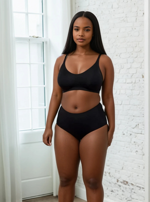 Ensemble de lingerie noir sans couture, alliant confort et élégance. Le soutien-gorge présente une coupe en V avec des bretelles réglables, offrant un maintien optimal sans armature. La culotte taille haute affine la silhouette et offre un excellent soutien tout en restant invisible sous les vêtements. La matière douce et extensible assure un confort optimal tout au long de la journée. Cet ensemble est idéal pour celles qui recherchent un sous-vêtement discret, confortable et élégant, à porter au quotidien ou pour une occasion spéciale.