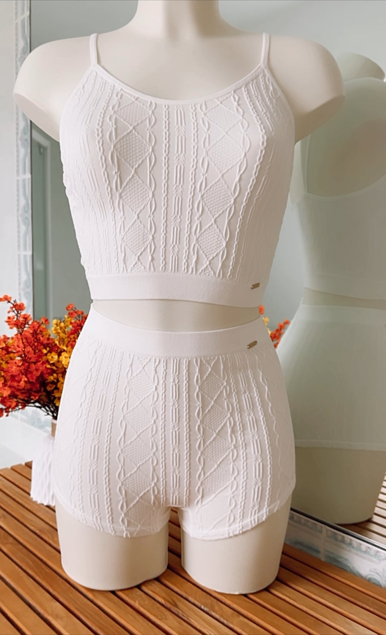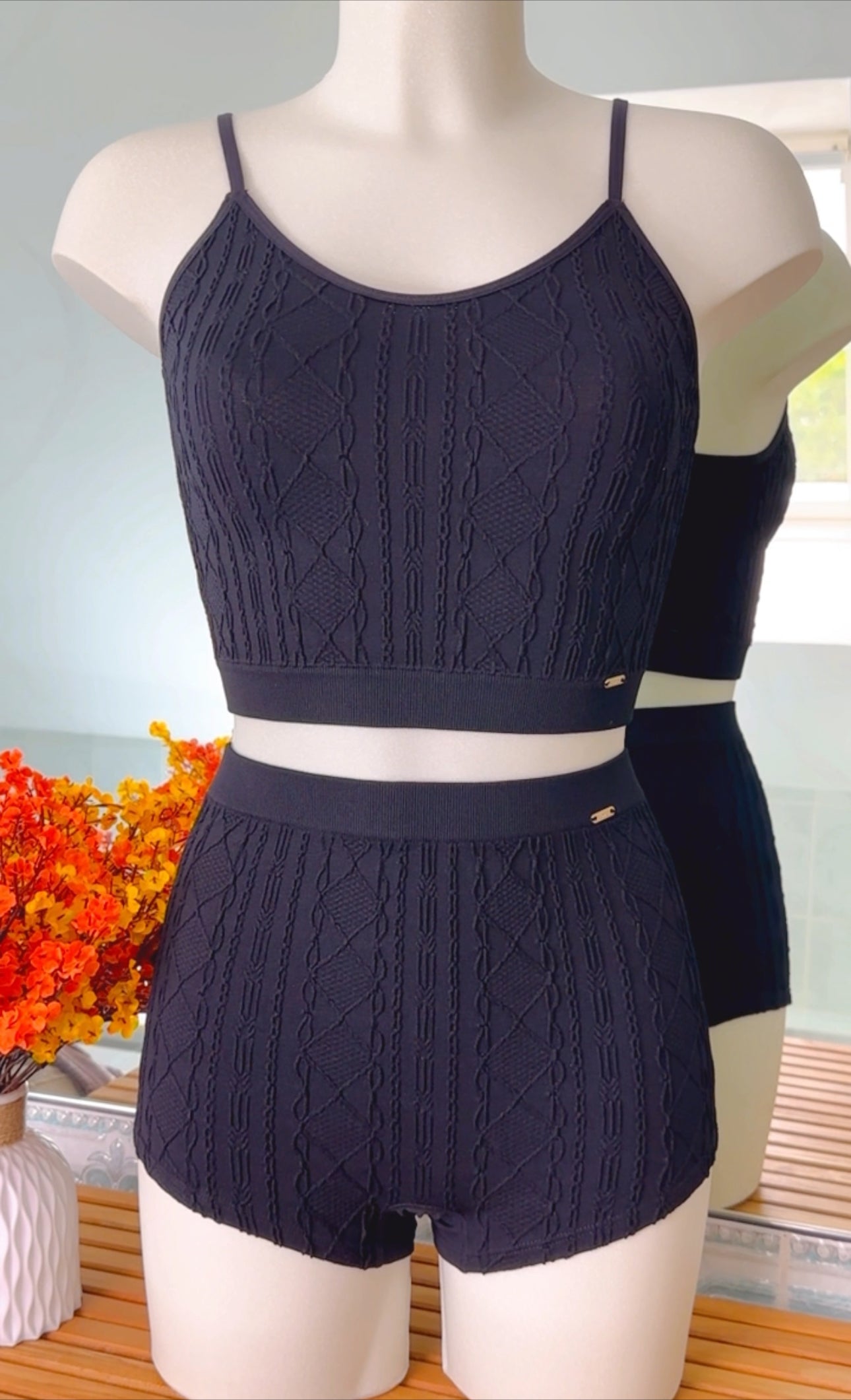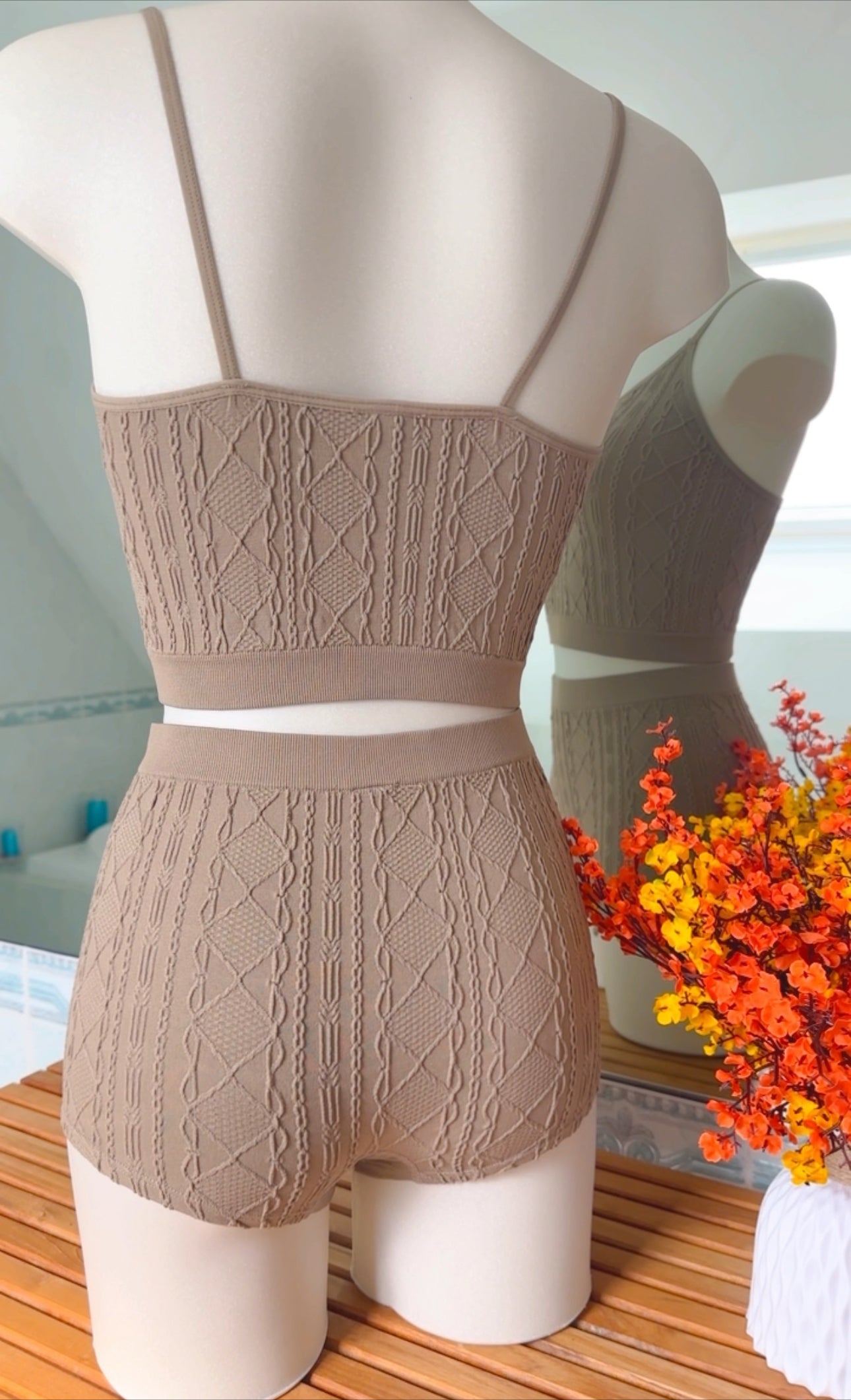 Découvrez notre ensemble lingerie tricoté conçu pour allier confort et style. Composé d'une brassière à bretelles fines et d'un short taille haute, cet ensemble est idéal pour celles qui recherchent une touche d'élégance dans leur tenue décontractée.