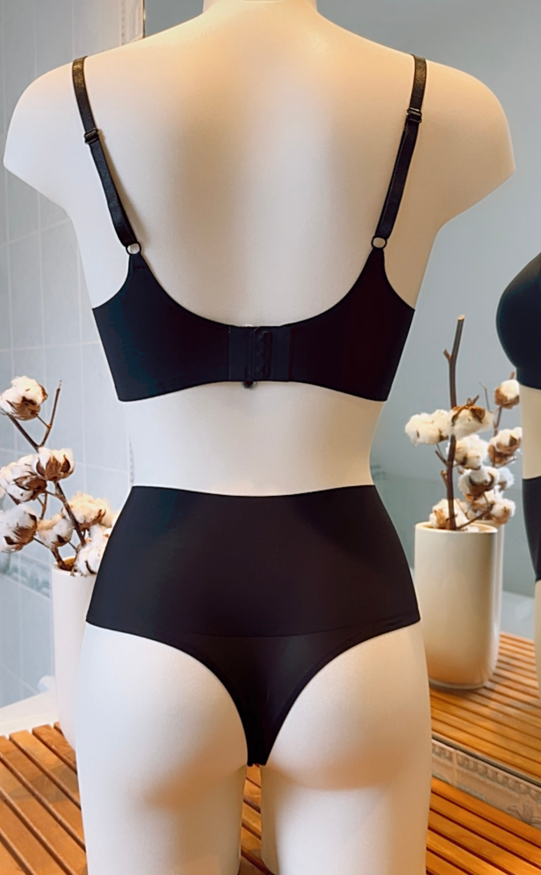 Ensemble de lingerie noir sans couture, alliant confort et élégance. Le soutien-gorge présente une coupe en V avec des bretelles réglables, offrant un maintien optimal sans armature. La culotte taille haute affine la silhouette et offre un excellent soutien tout en restant invisible sous les vêtements. La matière douce et extensible assure un confort optimal tout au long de la journée. Cet ensemble est idéal pour celles qui recherchent un sous-vêtement discret, confortable et élégant, à porter au quotidien ou pour une occasion spéciale.
